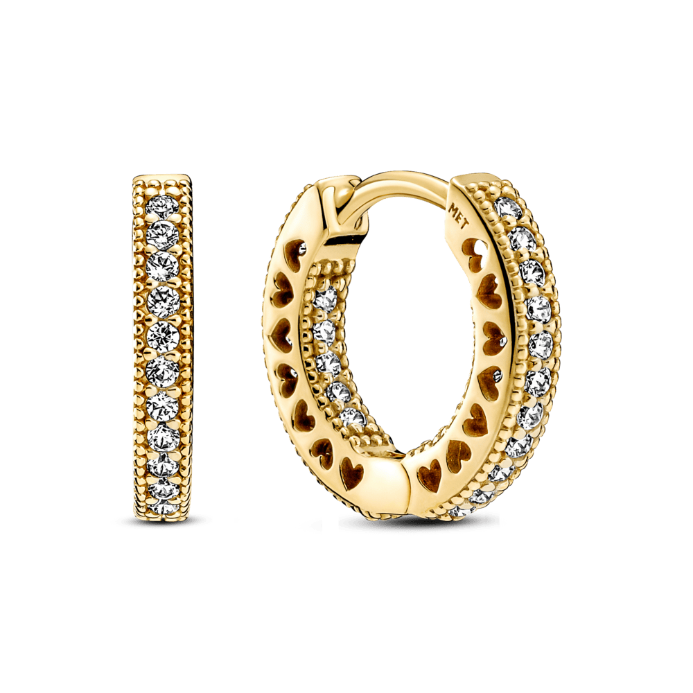 Piešķir sejai siltu akcentu ar šiem sirsniņformas riņķa auskariem ar pavé rakstu. Riņķiem ir ar roku uzklāts 14k zelta pārklājums. Riņķu iekšpusi un ārpusi rotā mirdzoši un caurspīdīgi pavé rakstā izkārtoti kubiskie cirkoniji un mikrolodītes, bet to sānos ir sirsniņformas izgriezumi. Šie ģeometriskie, izsmalcinātie un universālie auskari būs elegants papildinājums gan vienkāršam ikdienas tērpam, gan īpašiem gadījumiem.