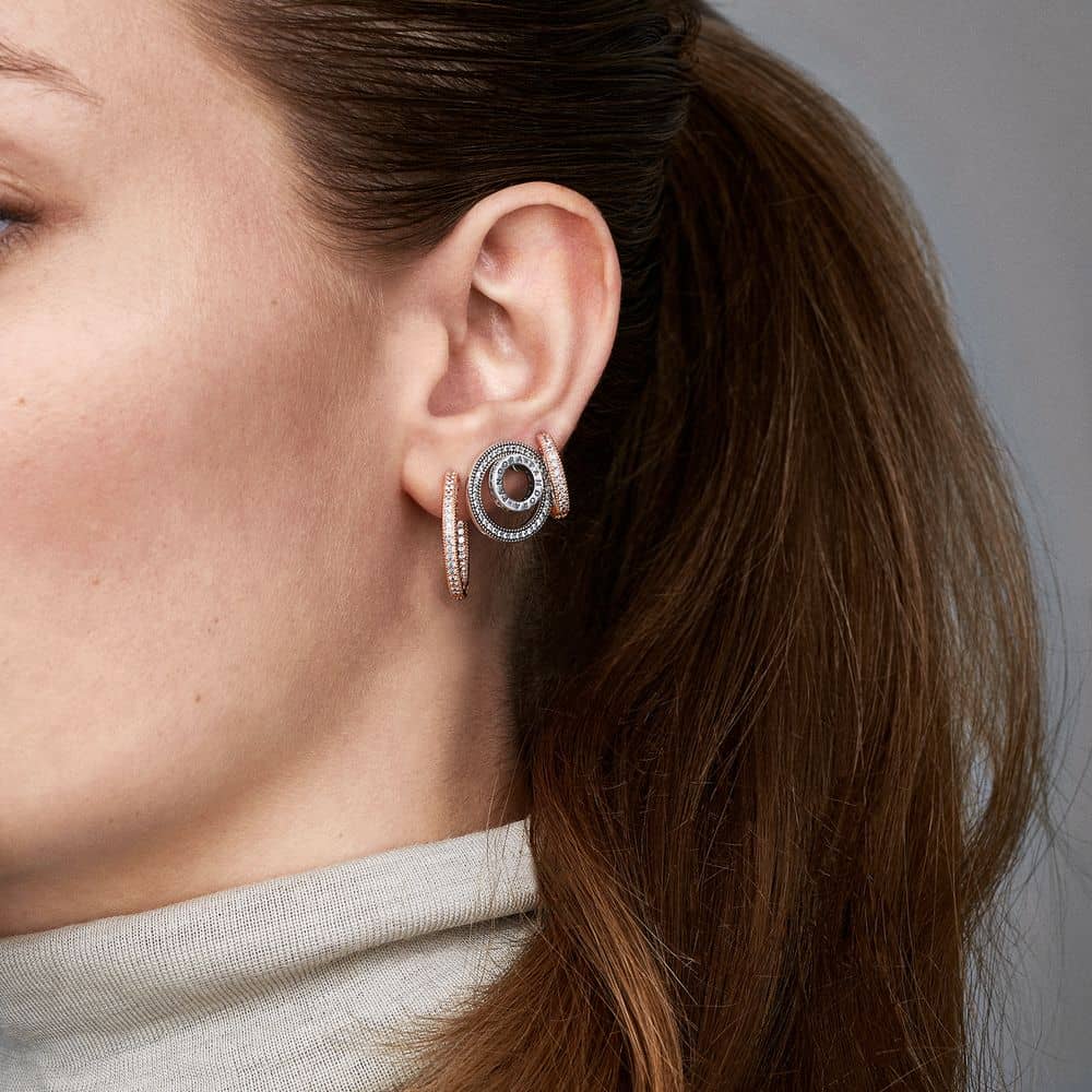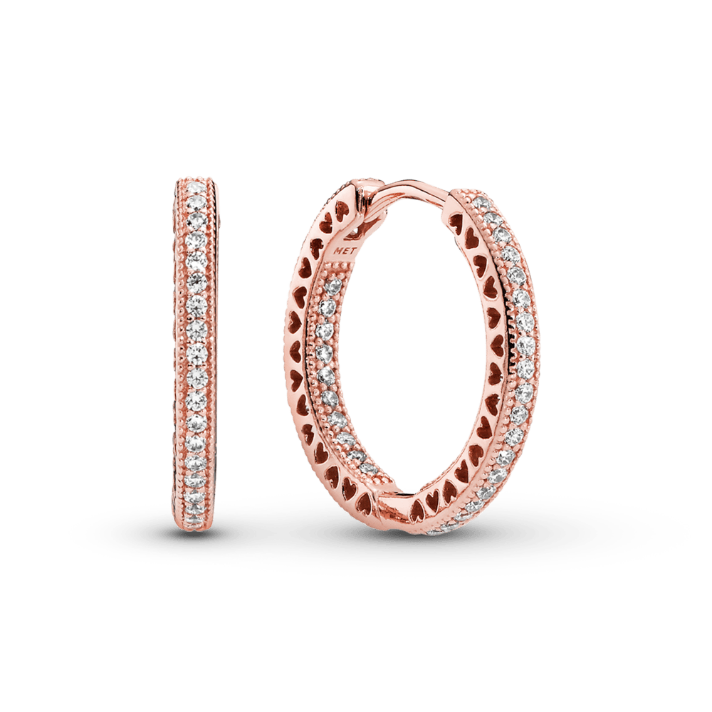 Šie mirdzošie riņķa auskari ar sirsniņām ir eleganti izliekti ap ausi un pārklāti ar 14k rozā zeltu. Auskarus rotā kubiskie cirkoniji, kā arī mūsu labi pazīstamie sirsniņformas izgriezumi to malās. Neuzkrītošais auskaru pāris piestāvēs jebkuram tērpam. Nēsā tos vienus pašus vai kopā ar citiem auskariem, ja tev ir vairāki auskaru caurumiņi.