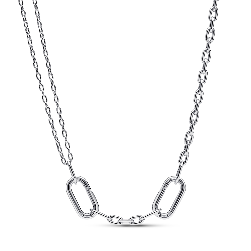 Šī ar 14k zeltu pārklātā Pandora ME dubultā posma ķēdītes kaklarota piedāvā nebeidzamas stila veidošanas iespējas. Tai ir divi atverami dekoratīvie savienotāji, kurus klāj rievotas līnijas, kas tos izceļ. Starp katru dekoratīvo savienotāju ir pieci posmi, un rotai ir neliela karabīnes aizdare. Puse no kaklarotu posmiem ir līdz pat dubultās ķēdītes detaļai, pievienojot ķēdītei individuālu malu. Vari saglabāt sākotnējo garumu, to palielināt vai pārvērst to pieguļošā kaklarotā. Tev vienkārši jāpievieno vai jānoņem ķēdītes posmi, kā vien vēlies. Kad posmu ķēdīte ir pielāgota, papildini to ar jēgpilniem medaljoniem un minipiekariņiem uz atveramajiem dekoratīvajiem savienotājiem, lai pastāstītu savu stāstu.