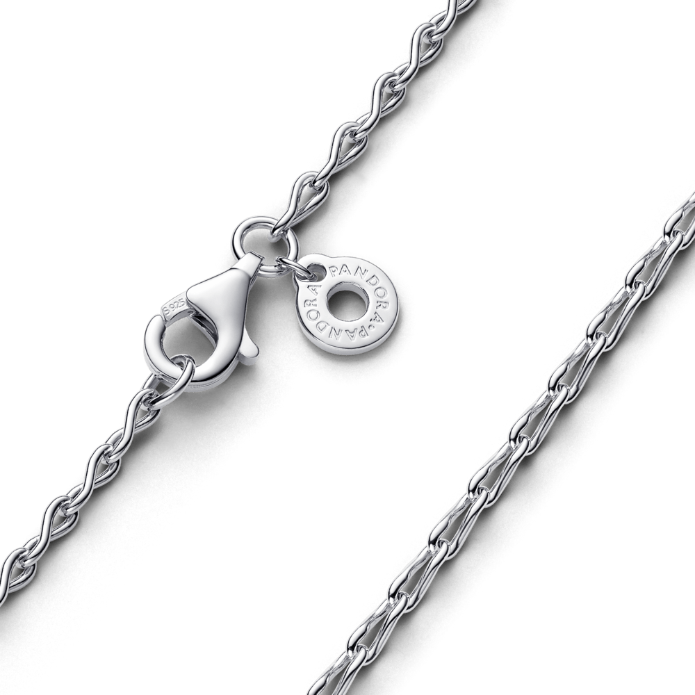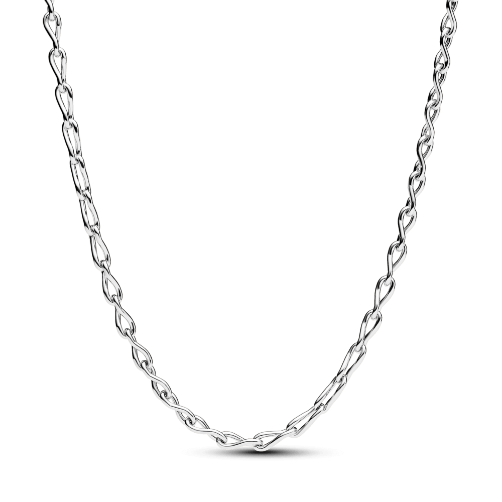 Mūsu bezgalības ķēdes kaklarota – eleganta, ar gaumīgu simboliku, ideāli sader kopā ar atveramo, gravējamo Mīlestības medaljona amuletu vai kādu citu sev iemīļotu kulonu. Katra sudraba bezgalības kaklarotas saite ir veidota kā nedaudz savīta bezgalības cilpa, radot rotaļīgu kustību izjūtu un simbolizējot mūžīgu mīlestību. Kaklarota ir regulējama trīs garumos, un tajā var ievietot nelielu Pandora O kulonu vai sirds formas O kulonu, vai līdz pat 6 amuletiem vai piekariņiem.