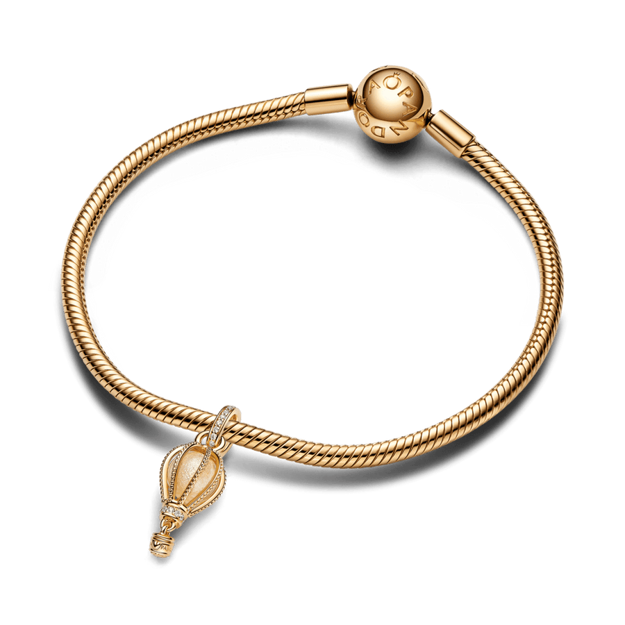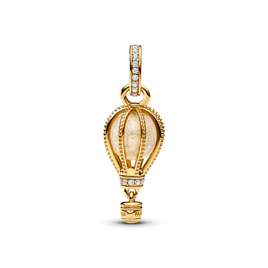Sasniedz jaunas virsotnes ar mirdzoši dzidro karstā gaisa balona amuletu. Šis silto toņu amulets ir rokām apstrādāts ar 14 k apzeltījumu. Pērlīšu virvēm ir mirdzošs caurspīdīgs Murano stikls, savukārt balona galviņu un pamatni rotā mirdzošš pavē. Zemāk ir neliela gondola, kas nogādās līdz galamērķim. Valkā to ikdienā vai uzdāvini kādam, kurš ir gatavs piedzīvojumam.