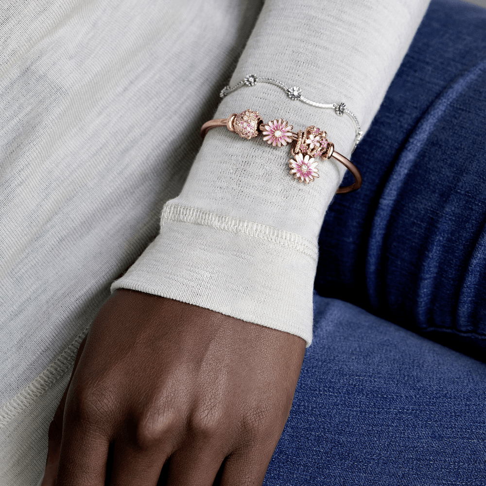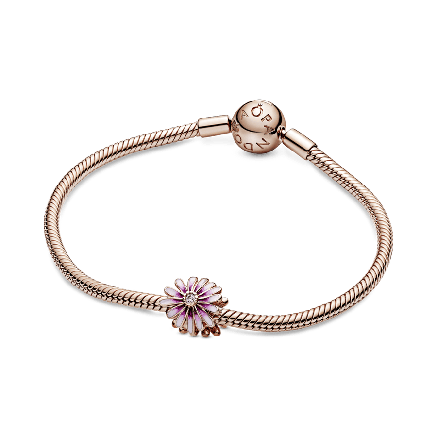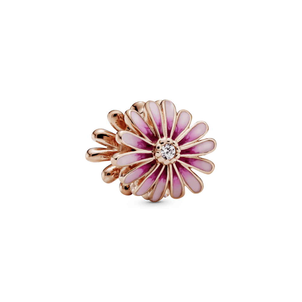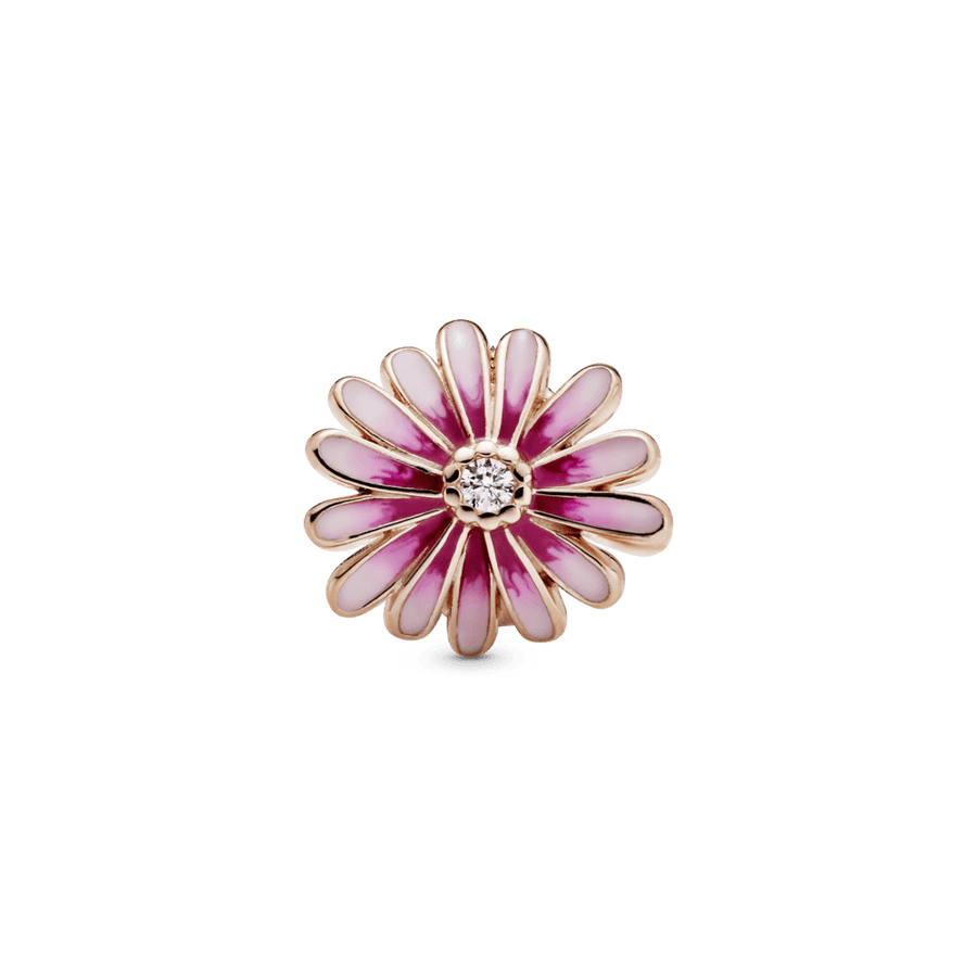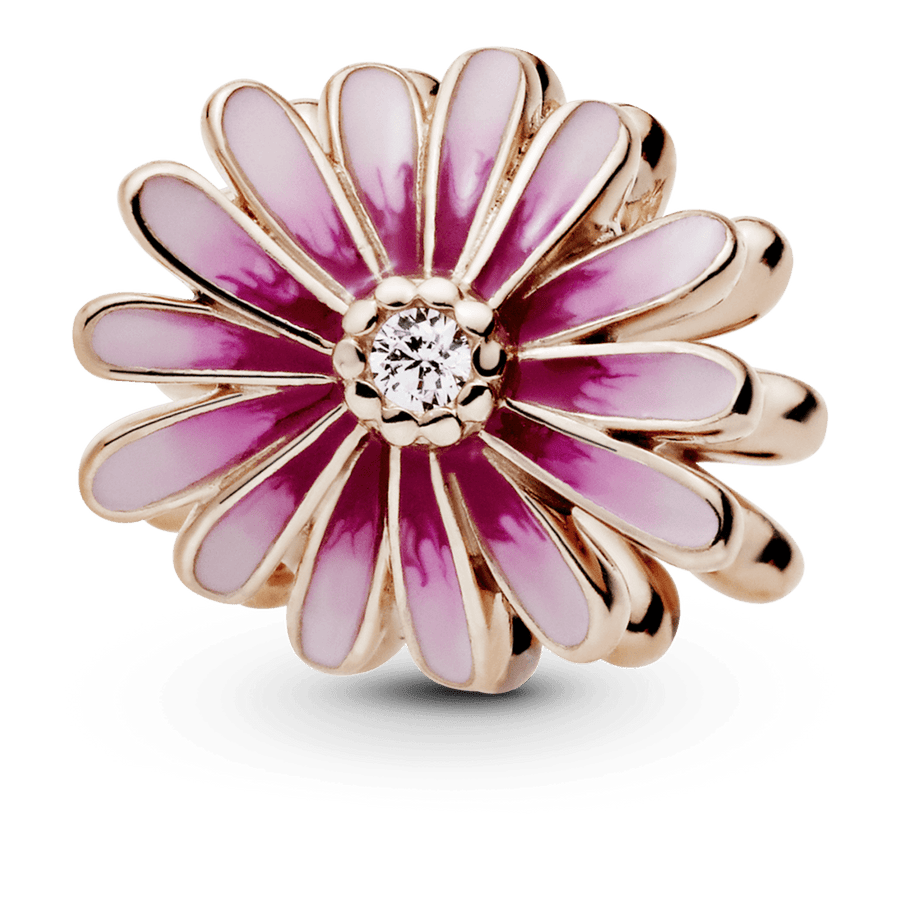 Padari margrietiņu par sava tēla centrālo elementu, nēsājot rozā margrietiņas amuletu. Šī rota ir apstrādāta ar roku un pārklāta ar 14k rozā zeltu. To rotā ar roku uzklāta sārta emalja, kuras nokrāsa mainās virzienā no mirdzošā centra līdz zieda malām. Abās zieda pusēs centrā ir novietots viens kubiskais cirkonijs. Amuleta iedvesmas avots ir margrietiņas izturība un mīlestība.