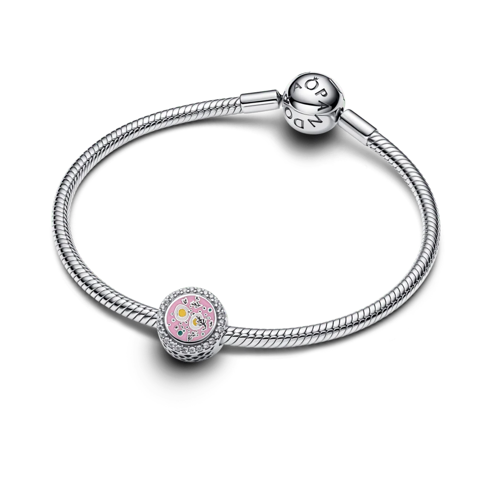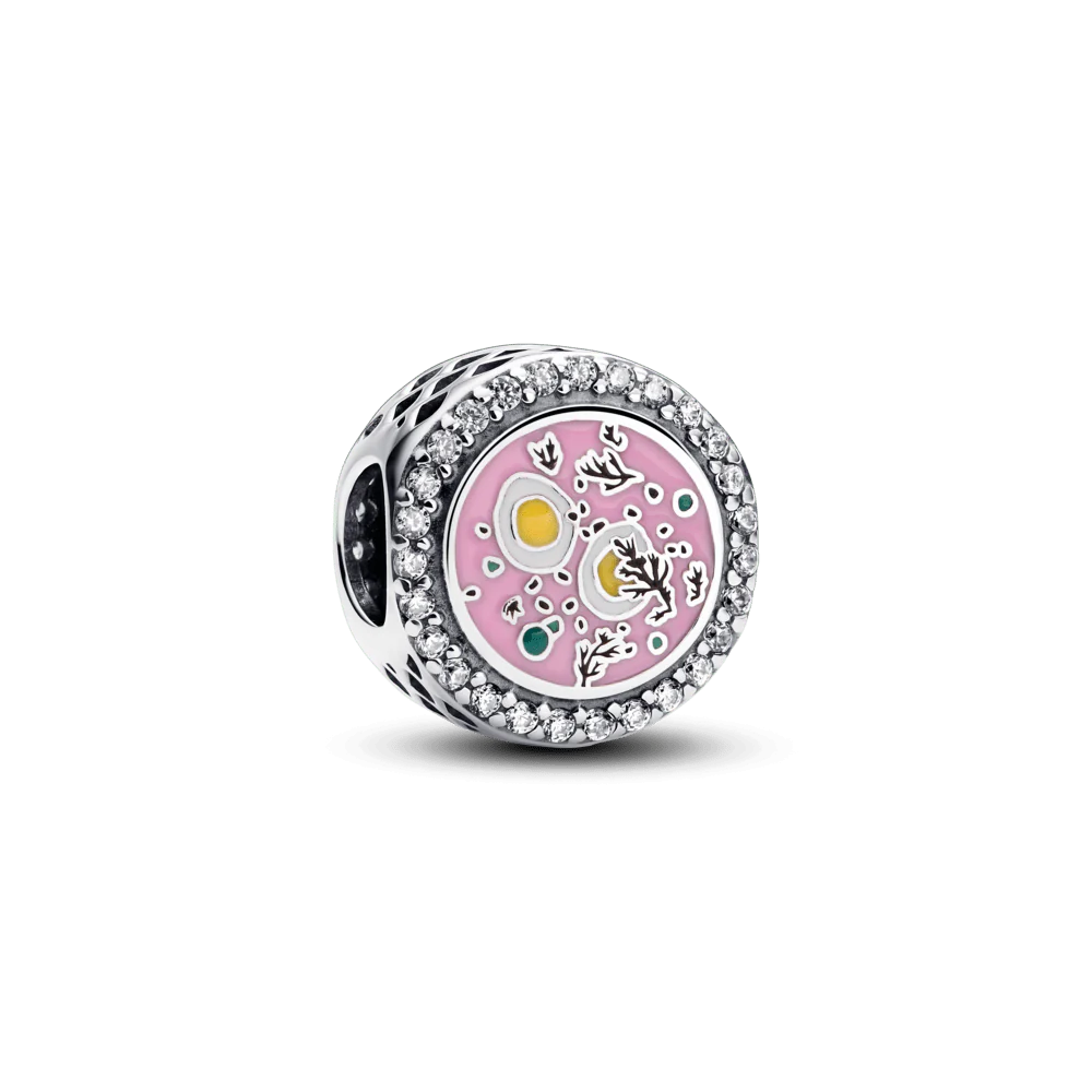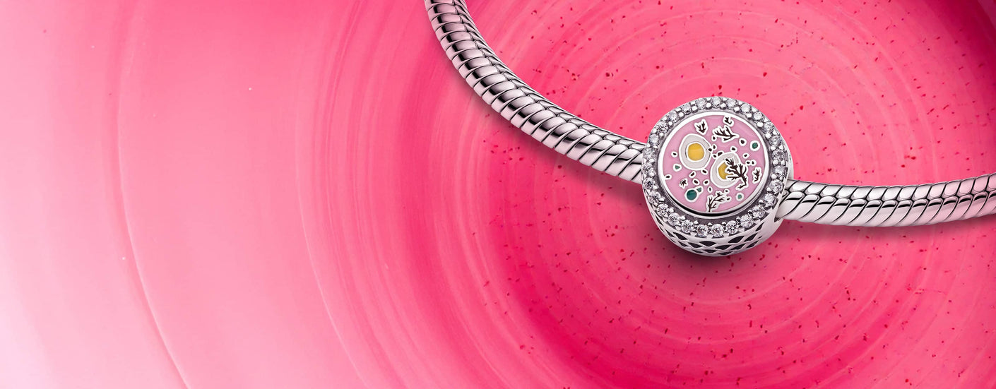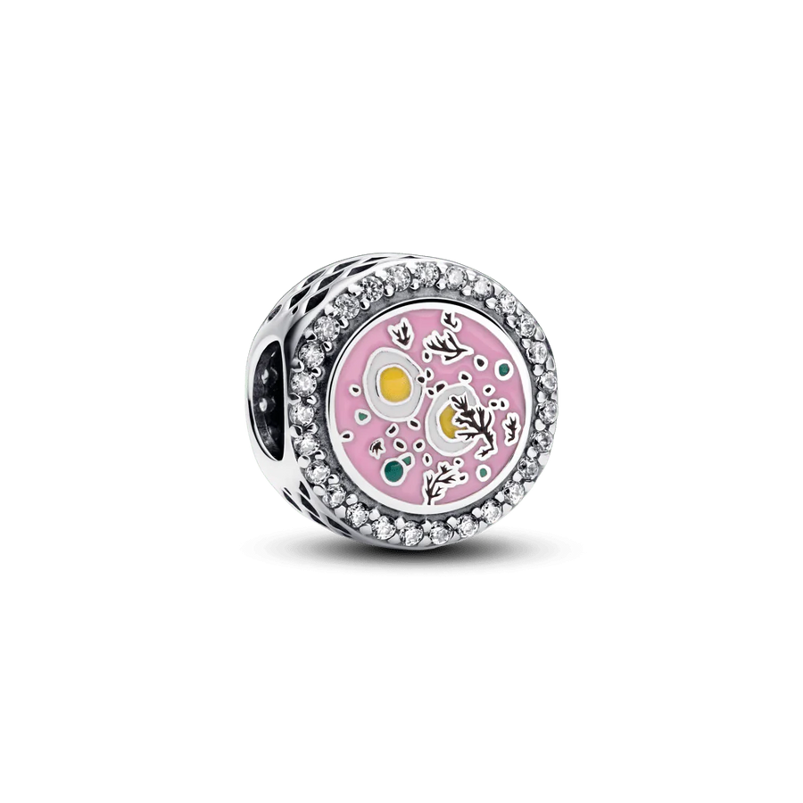 Informācija par rotu: sudraba amulets ar dzidru cirkoniju, rozā, dzeltenā, zaļā, baltā un melnā emalja.