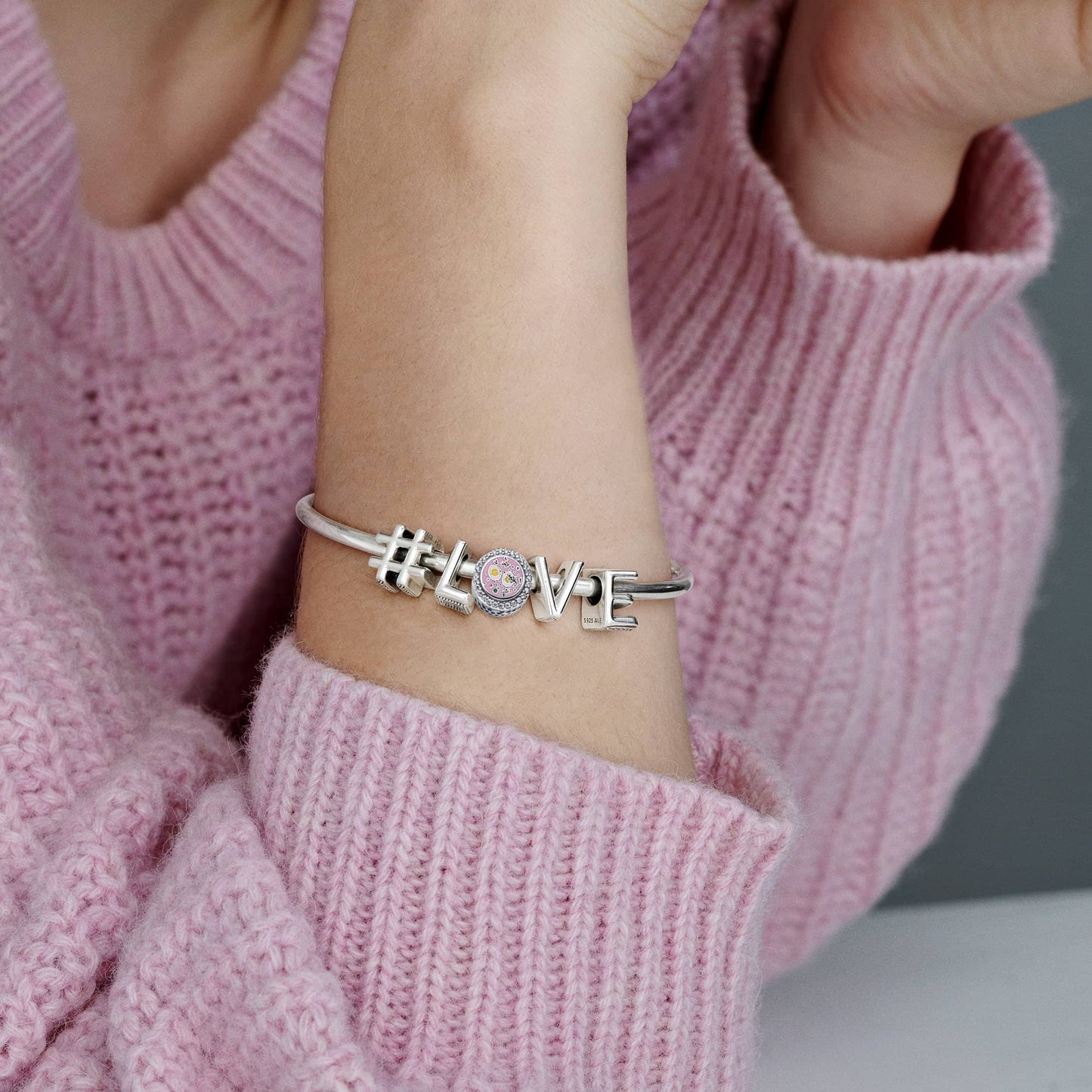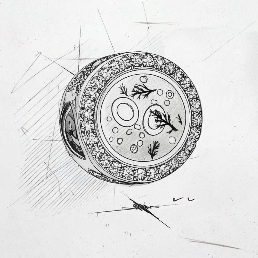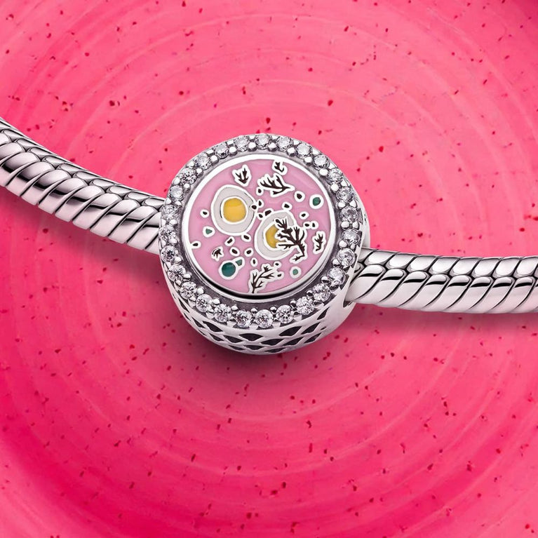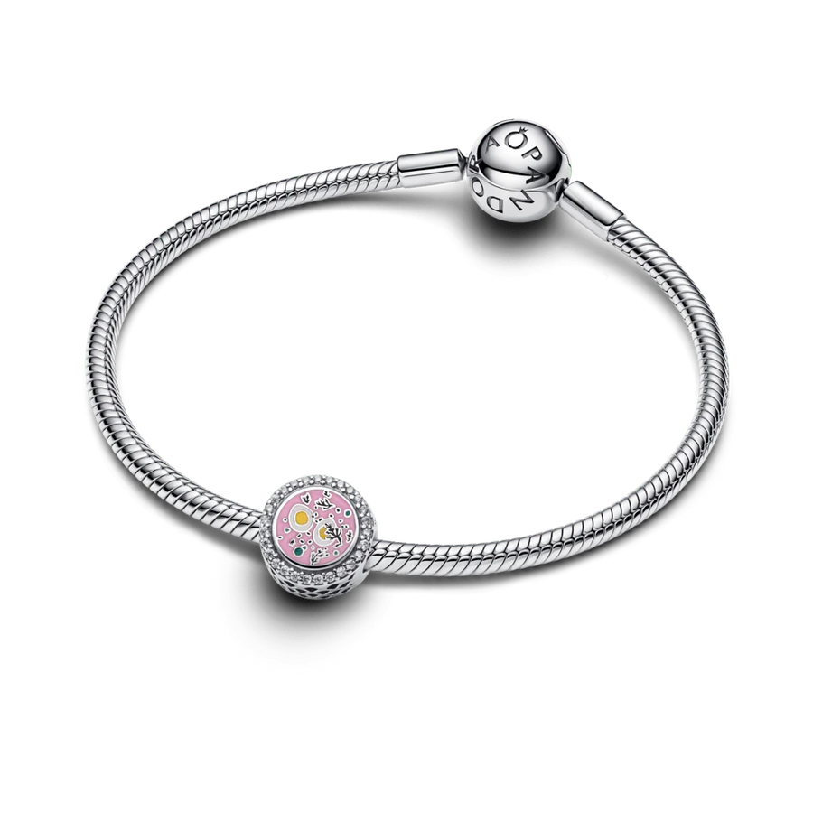 Informācija par rotu: sudraba amulets ar dzidru cirkoniju, rozā, dzeltenā, zaļā, baltā un melnā emalja.