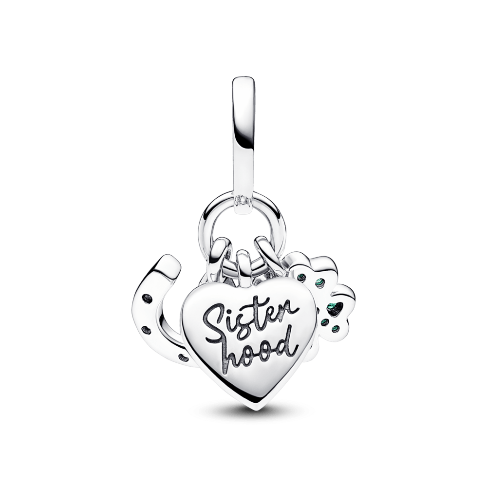 Piesaistiet veiksmi ar trīs simbolu: četrlapu āboliņa, sirds un pakava piekaramo amuletu. Šajā 925. proves sudraba piekaramajā amuletā izmantoti trīs dažādi veiksmes simboli, tostarp četrlapu āboliņš, sirds un pakavs. Sirdī iegravēts vārds “Sisterhood” (Māsu būšana). Pakavu rotā zaigojošs kubveida cirkonijs, sirsniņā lāso balts laboratorijā radīts opāls, savukārt āboliņā iestrādāti karaliski zaļie kristāli. Nēsājiet šo “Pandora Moments” amuletu kā veiksmes un aizsardzības simbolu vai uzdāviniet to kādam, kurš jums ir īpaši dārgs.